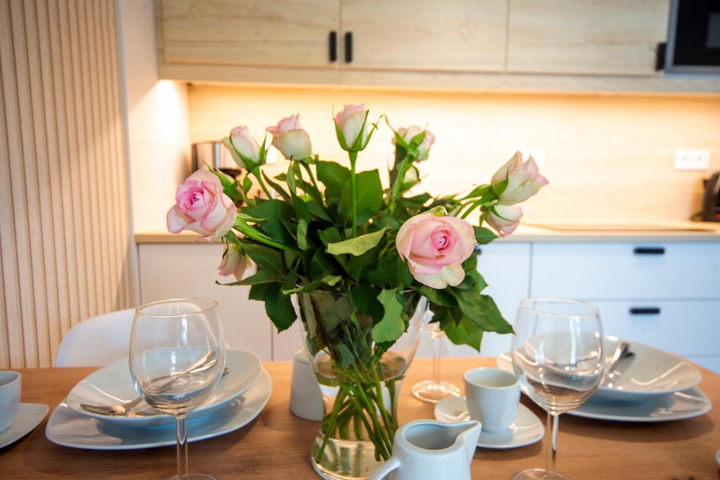 Oferta apartamentu obejmuje sypialnię (1), salon, aneks kuchenny z pełnym wyposażeniem, w tym lodówką i ekspresem do kawy, a także łazienkę (1) z prysznicem oraz suszarką do włosów. W apartamencie zapewniono ręczniki i pościel.